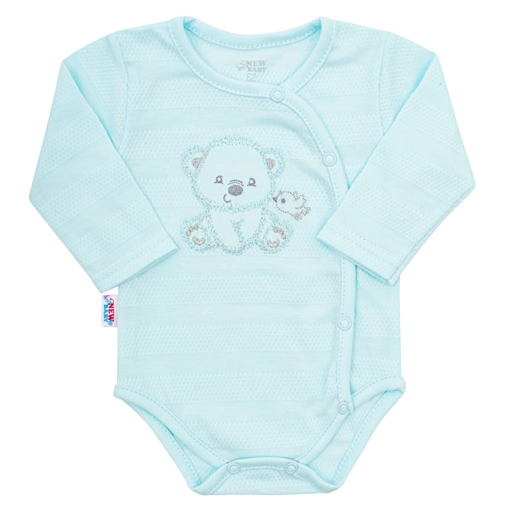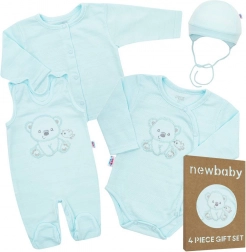 Zestaw NEW BABY Sweet Bear w kojącym niebieskim kolorze zawiera wszystko, co najważniejsze dla komfortu noworodka. Delikatna czysta bawełna jest oddychająca, przyjazna dla wrażliwej skóry i łatwa w pielęgnacji. Praktyczne zapięcia na napy w body, kaftaniku i śpiochach ułatwiają przewijanie oraz przebieranie bez zbędnego stresu.
