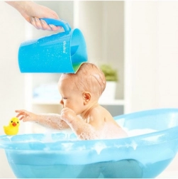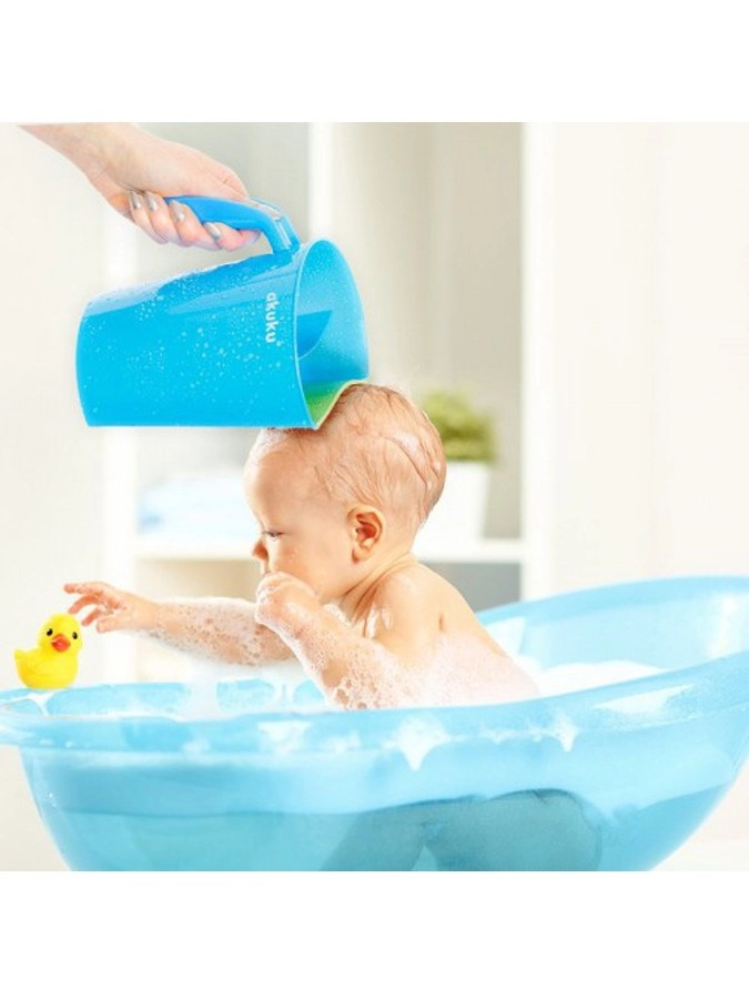 Praktyczny dziecięcy kubek do spłukiwania włosów AKUKU ułatwia kąpiel bez łez. Dzięki miękkiej elastycznej krawędzi woda nie spływa do oczu, podwójna komora zapewnia dokładne spłukanie, a ergonomiczny uchwyt wygodne nalewanie. Odpowiedni od urodzenia, bez BPA.