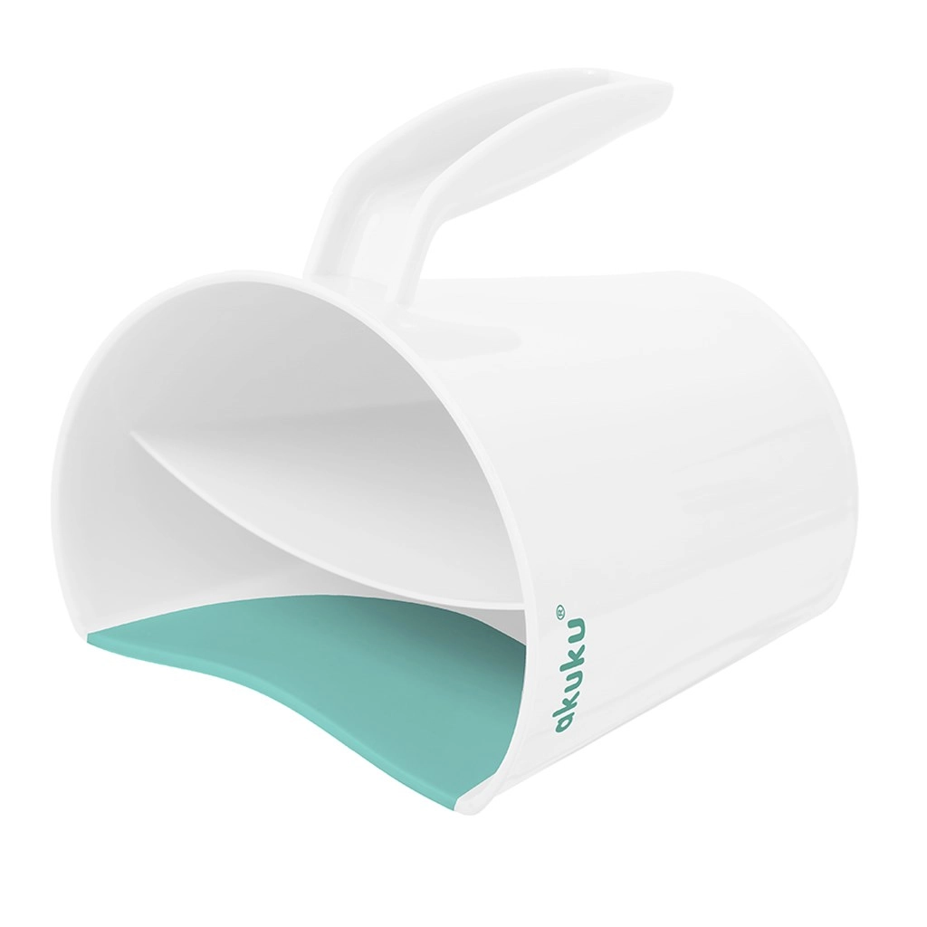 Kubek AKUKU w biało‑miętowym wydaniu to sprytny pomocnik do codziennej kąpieli niemowląt i starszych dzieci. Miękka, dopasowująca się krawędź delikatnie przylega do czoła i kieruje strumień wody tak, aby nie dostawał się do oczu. Dwie oddzielne komory umożliwiają kontrolowane nalewanie i równomierne spłukiwanie szamponu oraz piany.