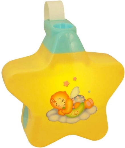 Obsługa jest intuicyjna – oddzielne przyciski pozwalają uruchomić muzykę i projekcję osobno lub razem, a 2 stopnie głośności dopasują dźwięk do potrzeb maluszka. Praktyczna rączka i plastikowy pasek montażowy zapewniają łatwe przymocowanie do łóżeczka lub kołyski.