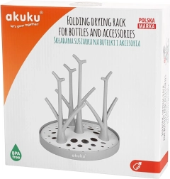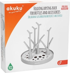 Praktyczny i kompaktowy ociekacz na butelki i akcesoria AKUKU zapewnia higieniczne suszenie dziecięcych butelek, smoczków i dodatków w domu i w podróży. Ma uniwersalną kompatybilność ze wszystkimi typami butelek, łatwo się składa i czyści, a dzięki specjalnie ukształtowanej podstawie skutecznie odprowadza wodę także poza zlew. Wykonany z bezpiecznych materiałów bez BPA.