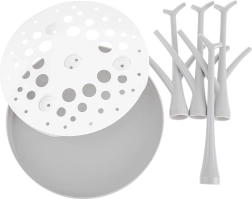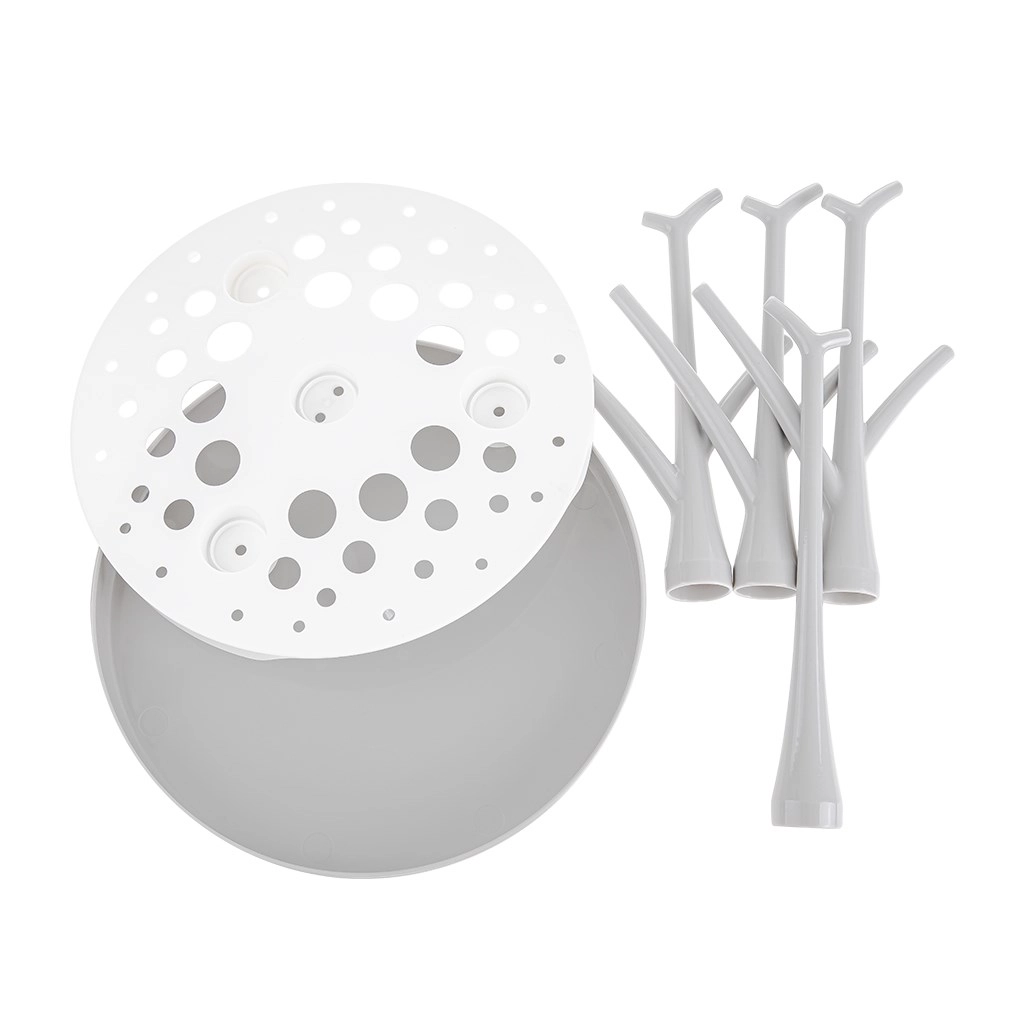 Rozgałęzione trzpienie utrzymują butelki, smoczki i akcesoria pionowo, aby woda szybko spływała, a wszystko schło szybciej.