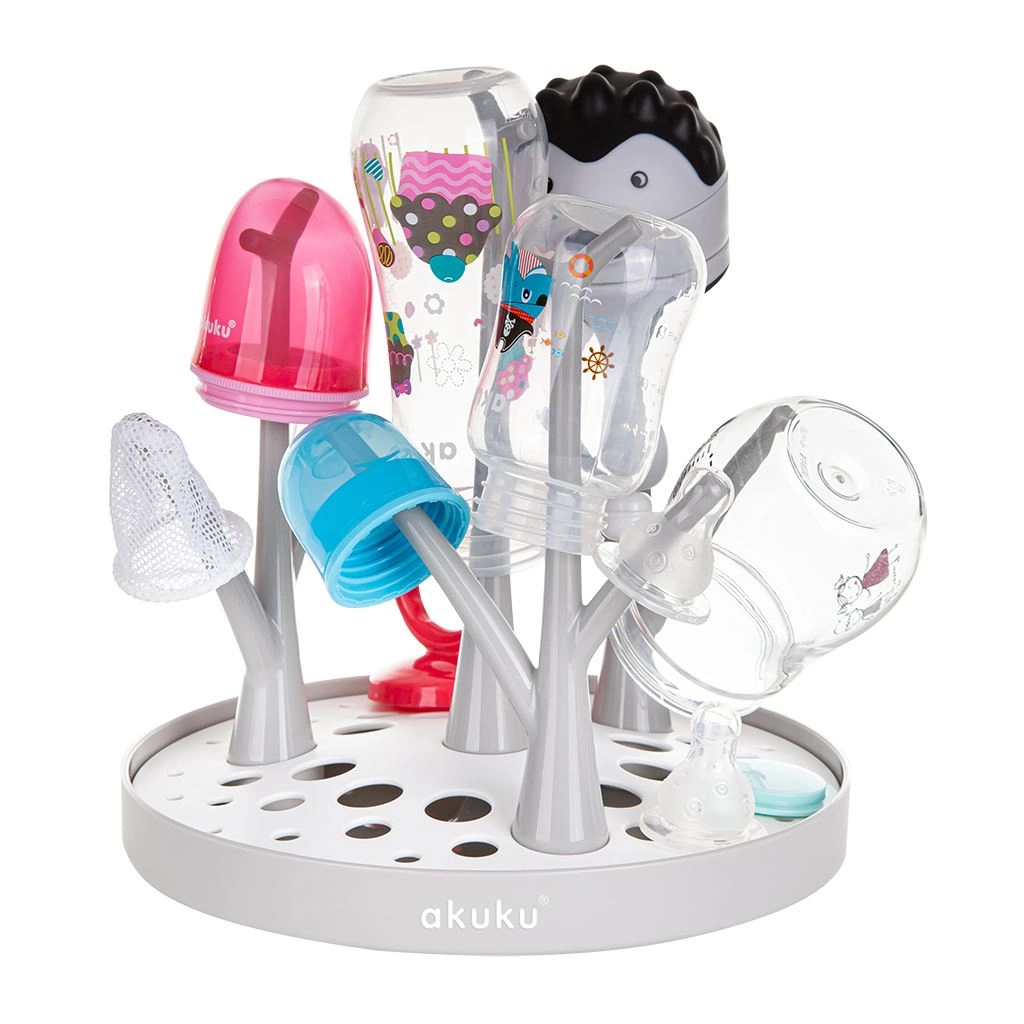 Ociekacz na butelki i akcesoria AKUKU to idealny wybór dla rodziców, którzy chcą mieć dziecięce akcesoria zawsze suche i gotowe do użycia. Drzewkowy system trzpieni utrzymuje butelki, smoczki i nakrętki w pozycji pionowej, aby woda szybko spływała, a powietrze swobodnie cyrkulowało. Kompaktowe wymiary i składana konstrukcja ułatwiają przenoszenie i przechowywanie, dzięki czemu sprawdzi się w kuchni i w torbie podróżnej.