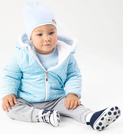 W skład zestawu wchodzi bawełniana czapeczka, która jest delikatna dla skóry dziecka i dobrze leży. Praktyczne zapięcie na suwak na całej długości ułatwia ubieranie i rozbieranie bez zbędnego przekręcania. Materiały na długo zachowują kształt i miękkość, więc płaszczyk pozostaje piękny nawet przy częstym noszeniu.