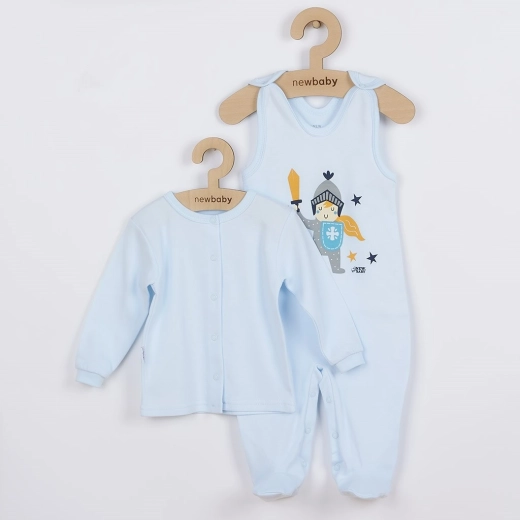 Niemowlęcy zestaw New Baby Knight jest idealny do codziennego noszenia w domu i na spacery. Dzięki miękkiej bawełnie jest przewiewny, miękki i wygodny, więc maluszek pozostanie w cieple i komforcie przez cały dzień. Jednokolorowy kaftanik łatwo połączyć z innymi ubrankami, a śpiochy zdobi uroczy rycerski motyw.