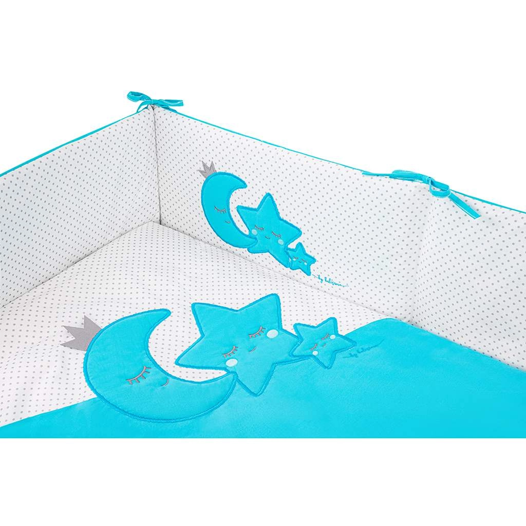 Spójny design w turkusie i bieli z aplikacjami księżyca i gwiazdek wspiera przyjemną, kojącą atmosferę ułatwiającą zasypianie.