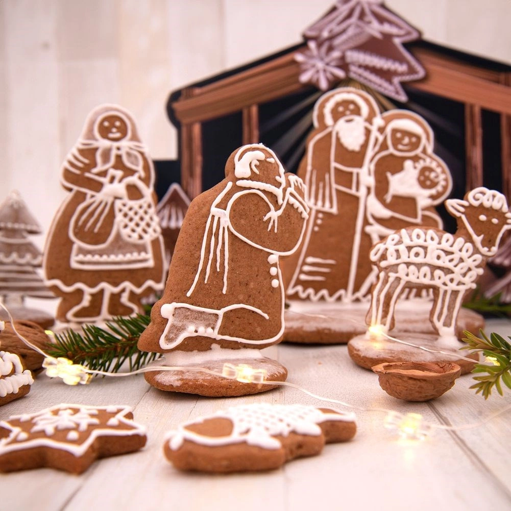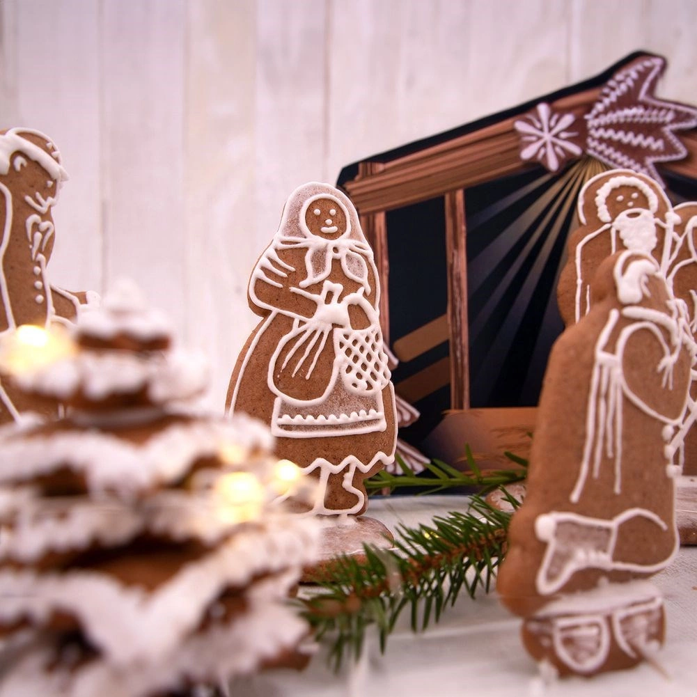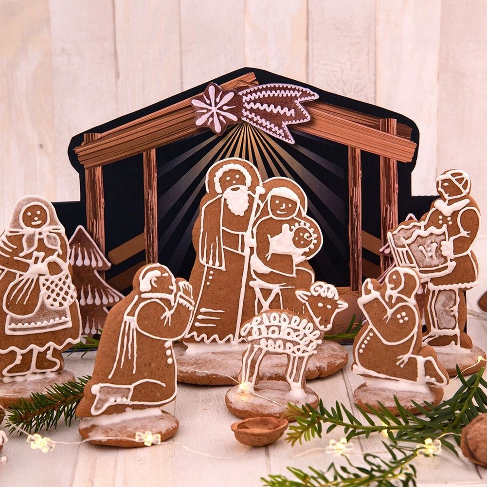Zestaw obejmuje postacie szopki oraz ozdobne tło, dzięki czemu po upieczeniu łatwo stworzysz efektowną świąteczną dekorację na stół lub parapet.
