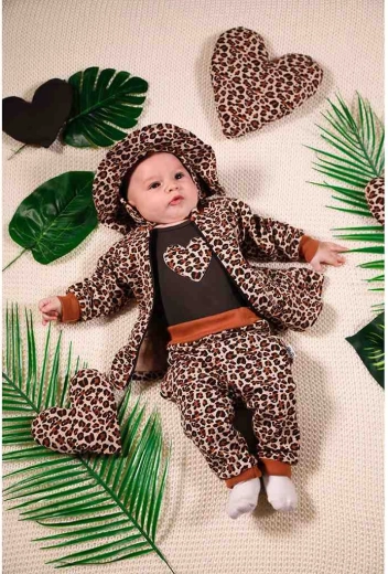 Stylowy niemowlęcy kapelusik z przyjemnej bawełny z motywem panterki i falbanką. Dzięki miękkiemu, elastycznemu materiałowi oraz wiązaniu na troczki doskonale trzyma się na główce i zapewnia komfort i wygodę przez cały dzień.