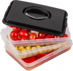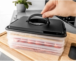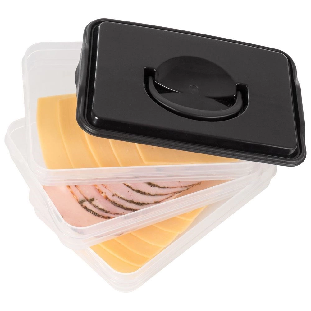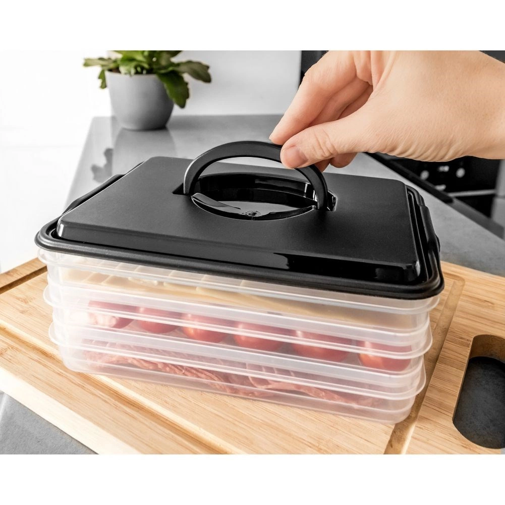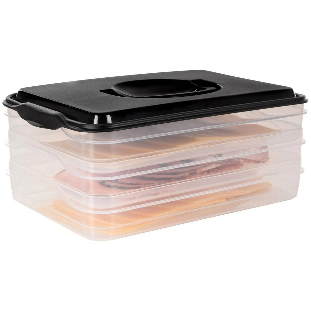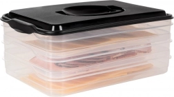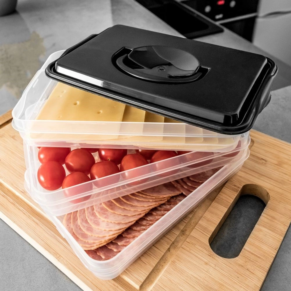 Ten inteligentny organizer żywności oferuje trzy oddzielne, przezroczyste poziomy do wygodnego przechowywania plastrów serów, wędlin i drobnych składników bez mieszania zapachów. Kompaktowy prostokątny kształt świetnie pasuje do półek lodówki, a solidna czarna pokrywa z uchwytem zapewnia łatwą obsługę.