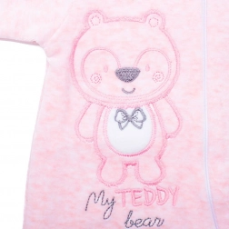 Różowy welurowy pajac dla niemowląt marki New Baby łączy delikatność, funkcjonalność i uroczy design z misiem. Całkowicie podszyta bawełniana podszewka jest gładka i przyjemna w dotyku, dlatego idealnie nadaje się dla wrażliwej skóry dziecka. Świetnie sprawdzi się w domu i na spacery w chłodniejsze dni.