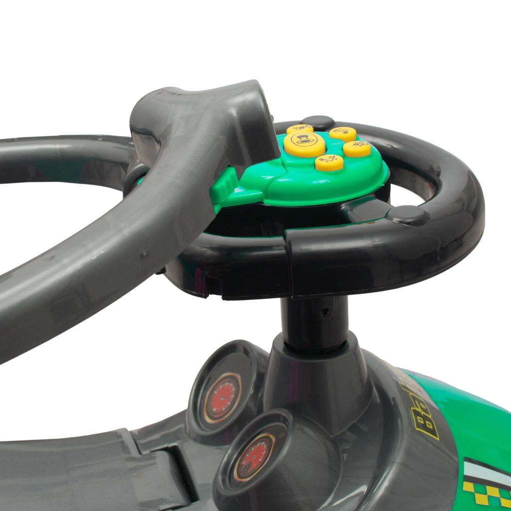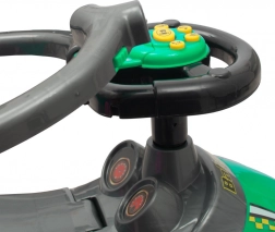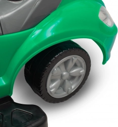 Multifunkcyjny jeździk/odpychacz 3w1 BABY MIX Mega Car w kolorze zielonym łączy w jednym odpychacz, jeździk i pchacz. Oferuje rączkę prowadzącą dla rodzica, boczne osłony bezpieczeństwa, odpinane podnóżki oraz muzyczną kierownicę z klaksonem. Dzięki stabilnej konstrukcji i schowkowi pod siedziskiem jest idealny dla dzieci od 12 do 36 miesięcy.