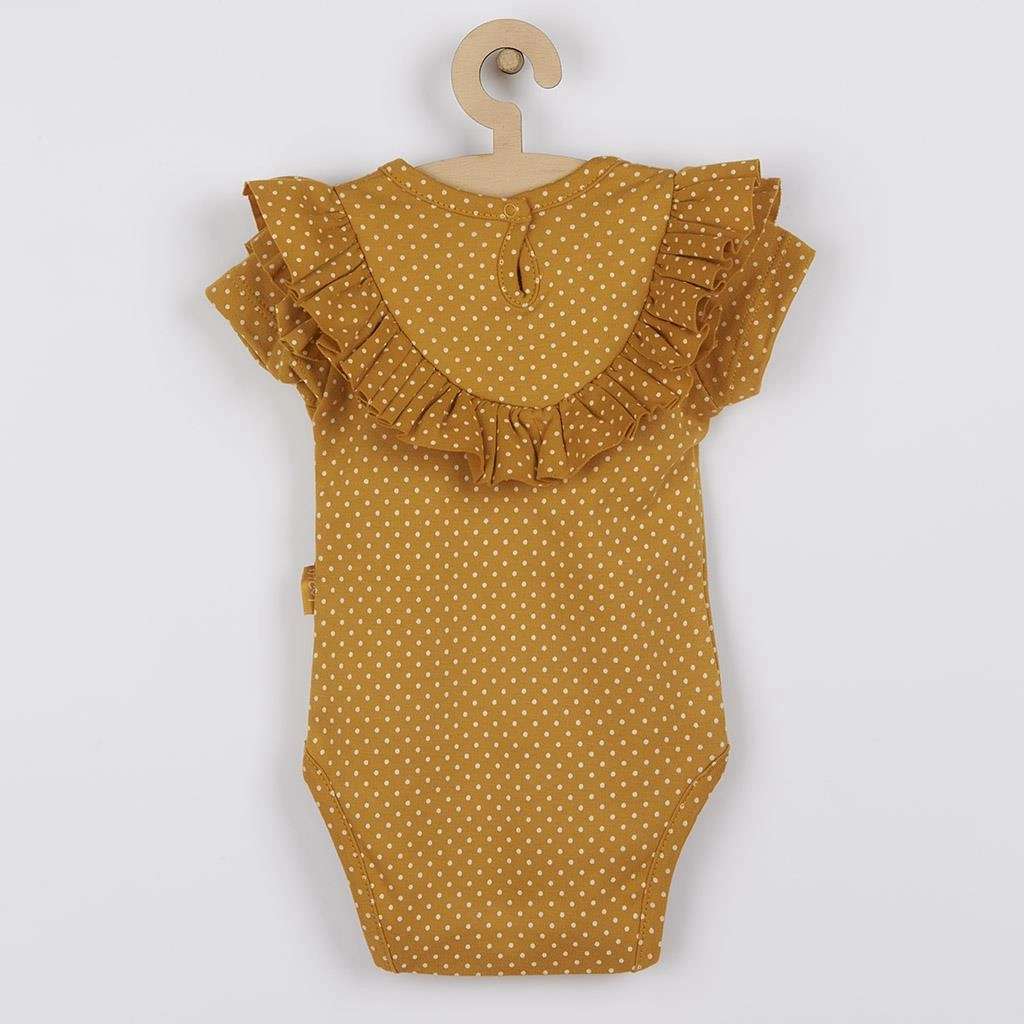 Urocze i wygodne body dziecięce z 100% bawełny z krótkim rękawem NICOL MICHELLE zachwycają miękkością, delikatnym nadrukiem i ozdobną falbanką. Praktyczne zapięcie na napy na ramieniu i w kroku ułatwia ubieranie oraz przewijanie. Idealne na co dzień – plecki maluszka pozostają podczas ruchu zawsze przykryte.