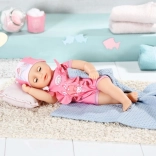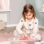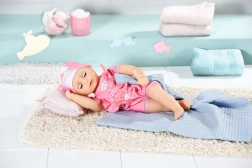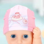 Ta wyjątkowa lalka ma różowy strój kąpielowy ozdobiony niebieskimi szwami i figlarnymi falbankami. Czepek pływacki zdobi obrazek wesołej kąpiącej się owieczki, co nadaje lalce niepowtarzalny charakter.