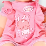 Różowy strój kąpielowy z niebieskimi szwami i wesołymi motywami nadaje lalce wyjątkowy wygląd.