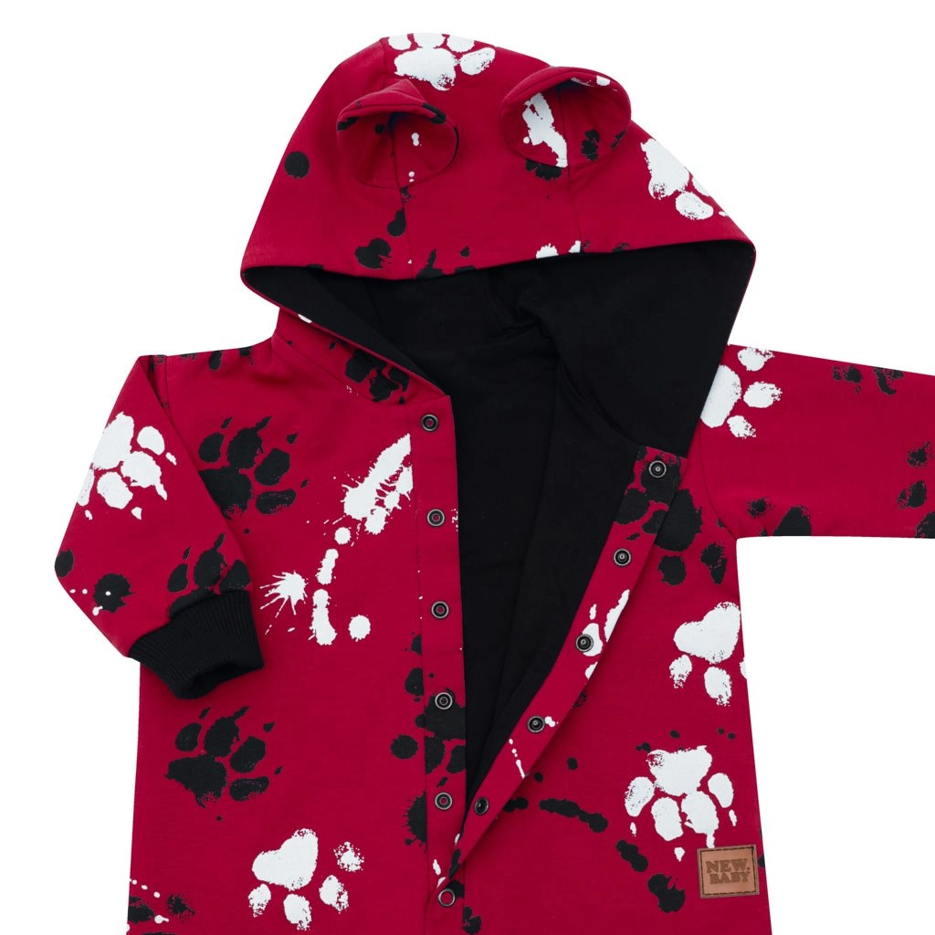 Praktyczne zapięcie na napy na całej długości znacznie ułatwia codzienne ubieranie i szybkie przewijanie. Kaptur z uszkami chroni przed chłodem i dodaje pajacykowi figlarnego charakteru, a szerokie elastyczne ściągacze przy rękawach i nogawkach trzymają wszystko na swoim miejscu. Całopowierzchniowy nadruk w motyw łapek podkreśla uroczy styl, idealny na spacery i domowy relaks.