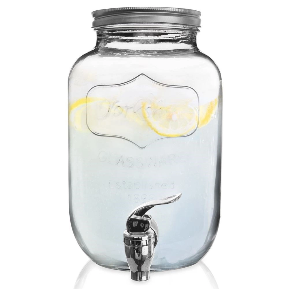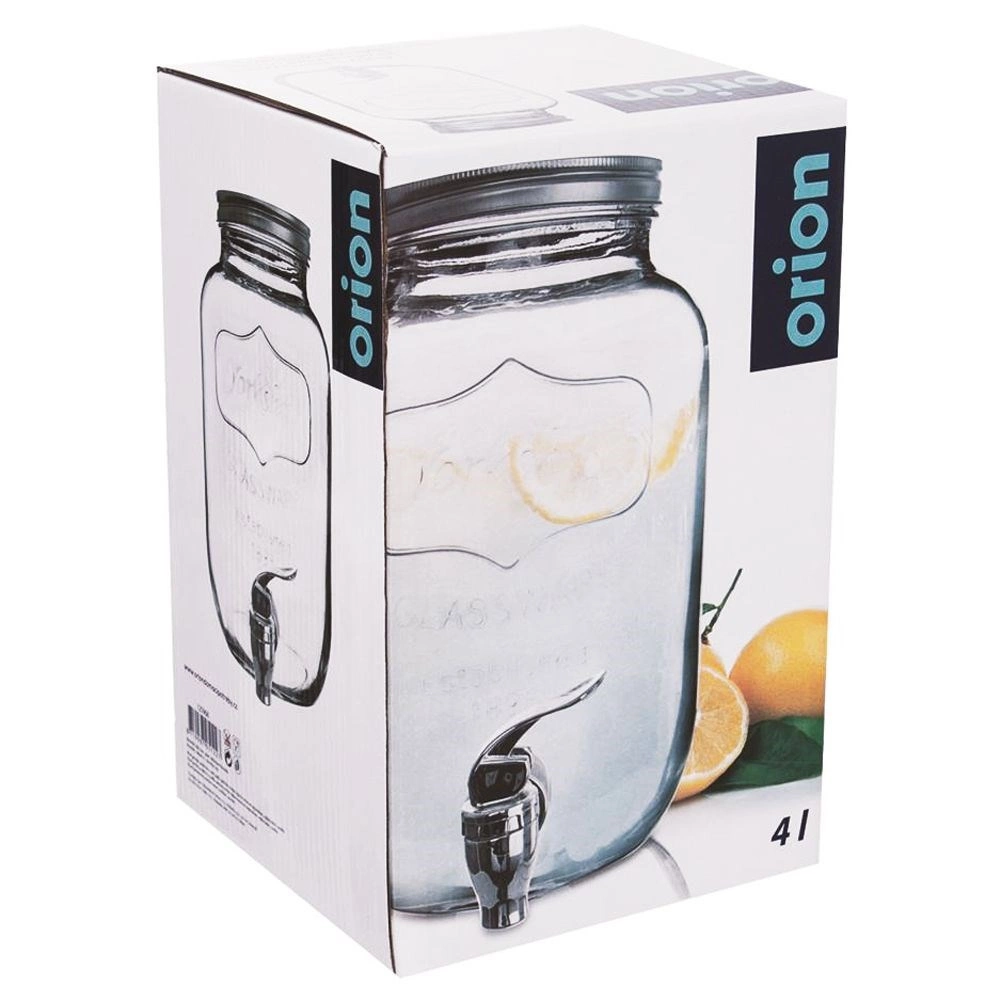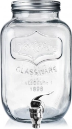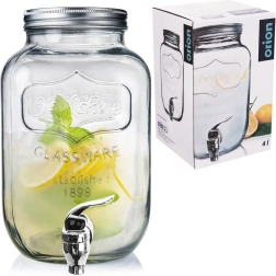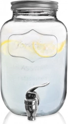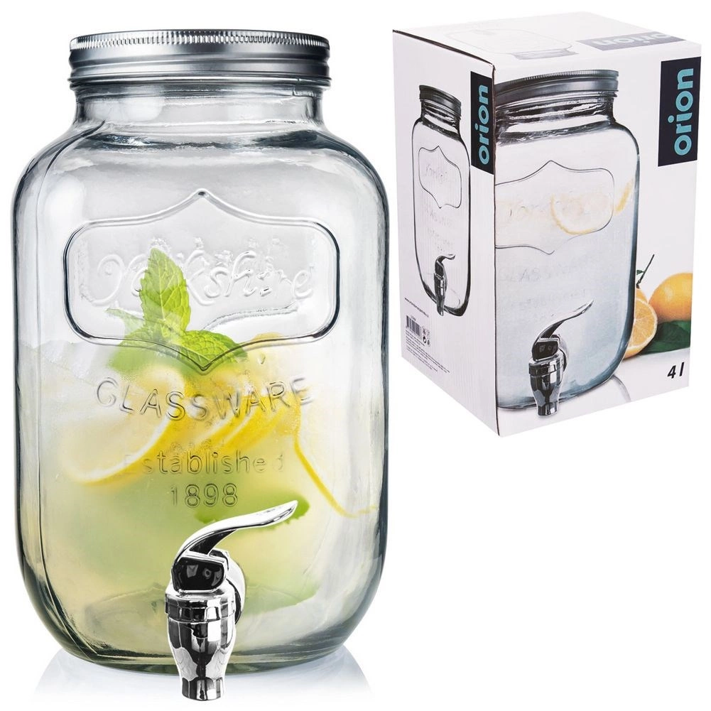 Stylowy szklany dyspenser do napojów o pojemności 4 l z metalową pokrywką i praktycznym kranikiem dla wygodnego nalewania. Idealny do lemoniady, wód owocowych, ponczu czy iced tea. Ma szeroki wlew dla łatwego napełniania i czyszczenia, bezpieczne materiały do kontaktu z żywnością oraz zamykana pokrywkę, która chroni napój przed owadami.