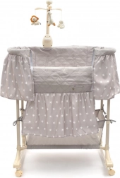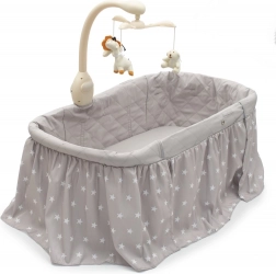 Praktyczna i bezpieczna kołyska oraz łóżeczko w jednym marki New Baby dla wygodnego snu i kojącego bujania. Oferuje czterostopniową regulację wysokości, mobilność dzięki kółkom z blokadą, odpinany daszek oraz karuzelę ze światłem, melodiami i wibracjami. Oddychający pokrowiec można łatwo zdjąć i wyprać, a dolny kosz do przechowywania trzyma wszystko pod ręką.