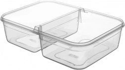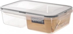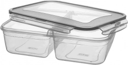 Praktyczne, dzielone pudełko na żywność o pojemności 2 l z solidną pokrywką, czterema klipsami i silikonową uszczelką dla doskonałej szczelności. Dzięki dwóm oddzielnym komorom utrzymuje smaki i zapachy oddzielone, jest bez BPA, odpowiednie do zmywarki, mikrofalówki (bez pokrywki), lodówki i zamrażarki oraz odporne na temperatury od -25 °C do +95 °C.