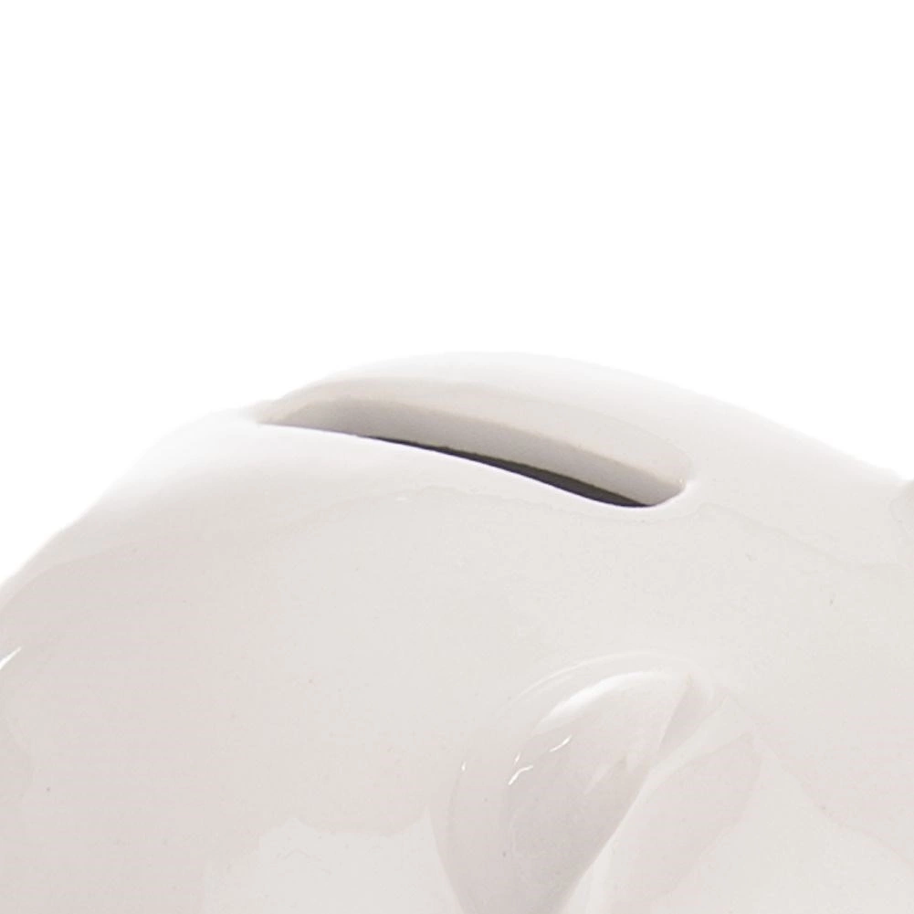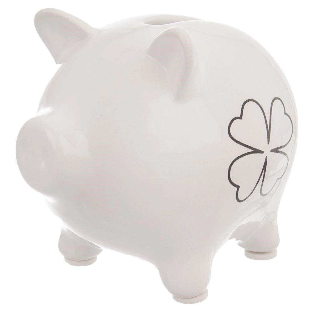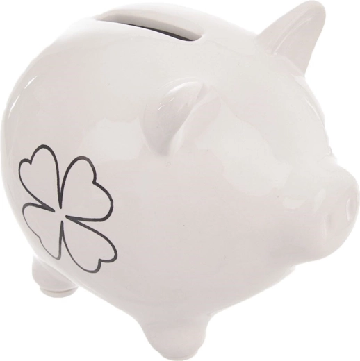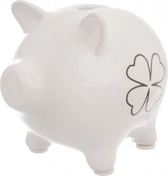 Stylowa biała ceramiczna skarbonka w kształcie świnki z motywem listka koniczyny nauczy Cię oszczędzać, a jednocześnie ozdobi wnętrze. Wykonana z wysokiej jakości ceramiki z błyszczącą glazurą. Nie ma otworu do wyjmowania monet – pieniądze można wyjąć wyłącznie poprzez stłuczenie, co wspiera zdyscyplinowane odkładanie. Świetny pomysł na prezent dla dzieci i dorosłych.