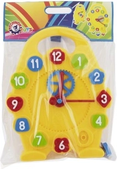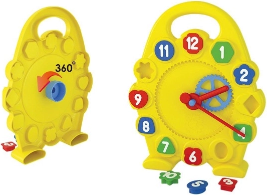Każde dziecko lubi się uczyć, byle nie było nudno. Dzięki tej układance dzieci poćwiczą małą motorykę, korzystając z kształtów do wkładania z cyframi. Dziecko w zabawny sposób poznaje odczytywanie godzin, obracając mechanicznie dużą wskazówkę, która za pomocą zębatki porusza także małą wskazówką.