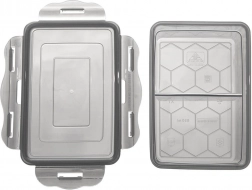 Praktyczny i wytrzymały dzielony pojemnik na żywność o pojemności 500 ml z silikonową uszczelką oraz czterema klipsami dla bezpiecznego zamknięcia. Dwie oddzielne komory utrzymują smaki i zapachy oddzielnie. Nadaje się do mikrofalówki (bez pokrywki), zmywarki, lodówki i zamrażarki. Bez BPA, z przezroczystego ciemnoszarego plastiku dla szybkiej kontroli zawartości.