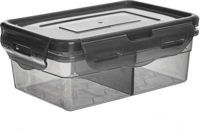 Utrzymuj jedzenie świeże i czytelnie rozdzielone dzięki pojemnikowi z szczelną pokrywką. Przezroczysty ciemnoszary materiał umożliwia natychmiastową kontrolę zawartości bez otwierania, a silikonowa uszczelka oraz 4 solidne klipsy zapewniają niezawodne zamknięcie i minimalizują ryzyko wycieku płynów.