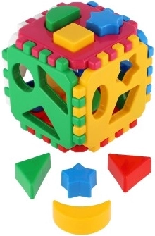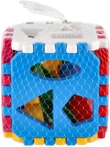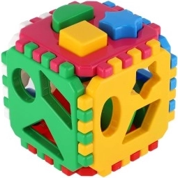 Zawartość opakowania obejmuje elementy do złożenia kostki oraz zestaw kształtów do przekładania przez odpowiadające im otwory. Wytrzymałe, plastikowe wykonanie i kompaktowe wymiary 12 × 12 × 12 cm sprawiają, że to świetna zabawka w domu i w podróży.