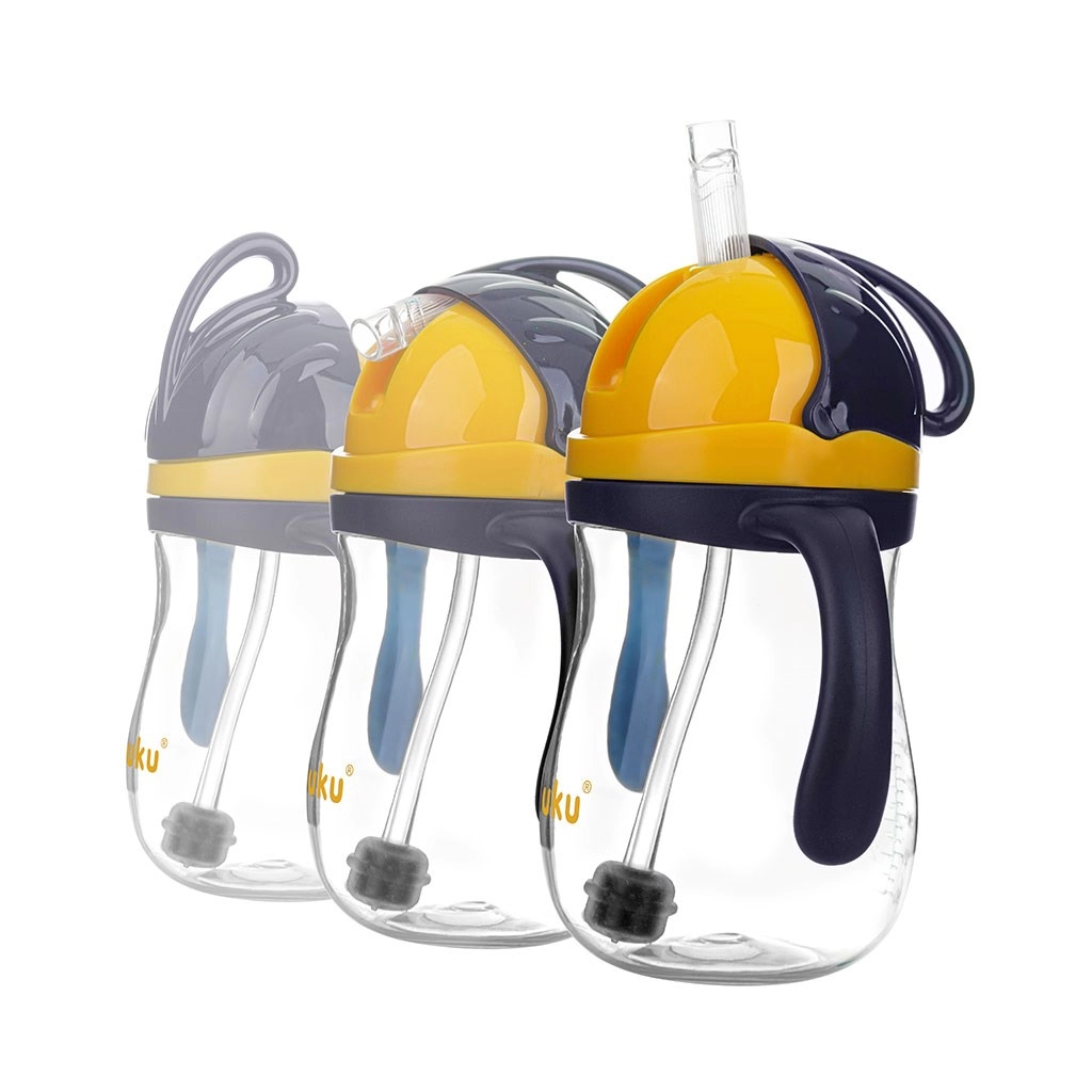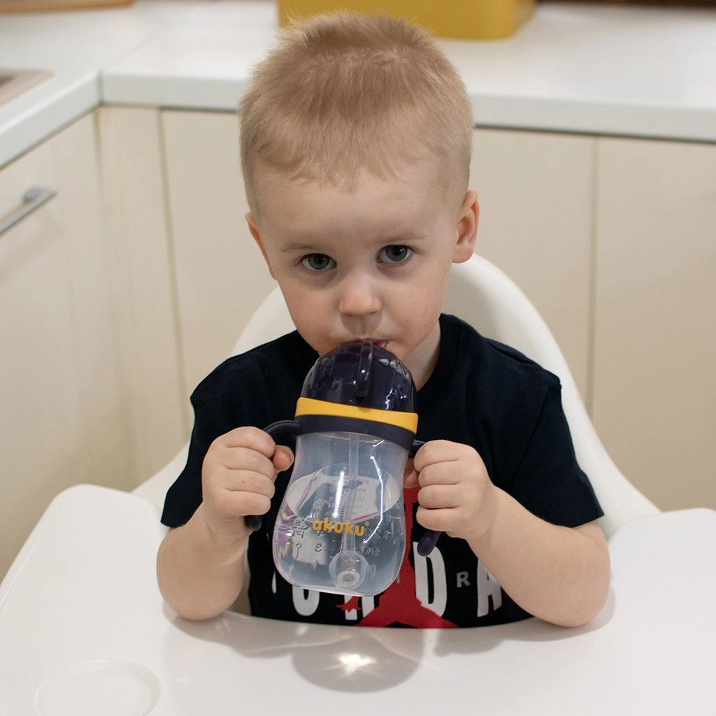 Dziecięca butelka Akuku z silikonową słomką z obciążnikiem została zaprojektowana do samodzielnego picia bez rozlewania. Obciążnik na końcu słomki podąża za poziomem napoju, dzięki czemu dziecko może wygodnie pić w pozycji siedzącej, w wózku, a nawet trzymając butelkę do góry dnem. Klapka flip chroni słomkę i zapobiega zabrudzeniom.