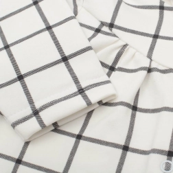 Bluza i spódniczka na jednolitym białym tle z szarym, kratkowanym wzorem dla spójnego, eleganckiego wyglądu.