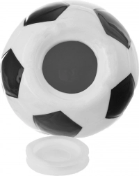 Stylowa ceramiczna skarbonka w kształcie piłki nożnej o wymiarach 10 × 9 cm. Dzięki dolnemu otworowi jest otwierana, więc monety wyjmiesz bez rozbijania. Wysokiej jakości ceramika w czarno-białej kolorystyce, praktyczna do przechowywania drobnych i jednocześnie dekoracyjna dla fanów piłki nożnej. Świetny pomysł na prezent dla dzieci i dorosłych.
