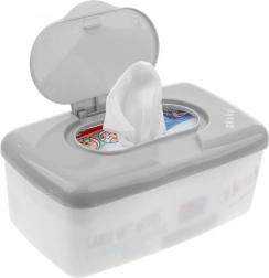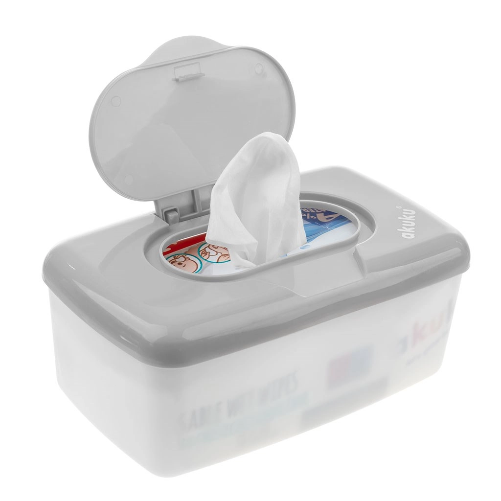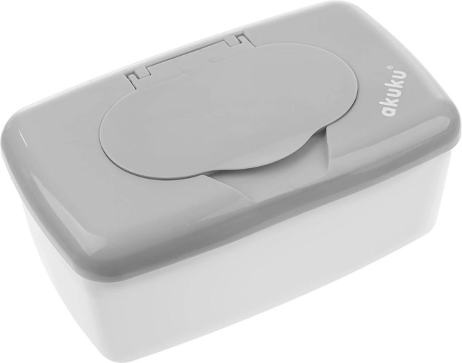 Praktyczne pudełko na chusteczki nawilżane AKUKU w szarym kolorze utrzymuje chusteczki świeże i wilgotne w domu i w podróży. Dzięki kompaktowym wymiarom łatwo mieści się w torbie, jest lekkie, a pokrywka z dużym przyciskiem umożliwia otwarcie jedną ręką.