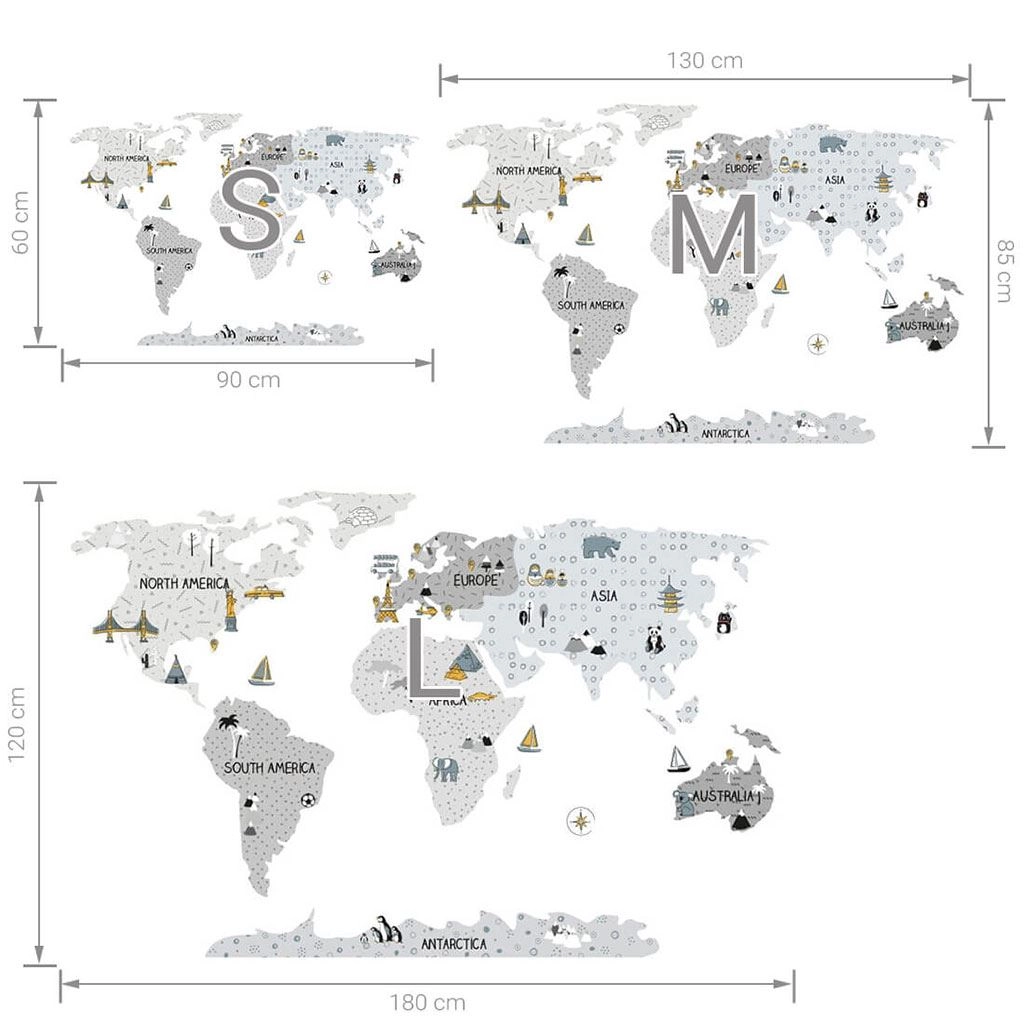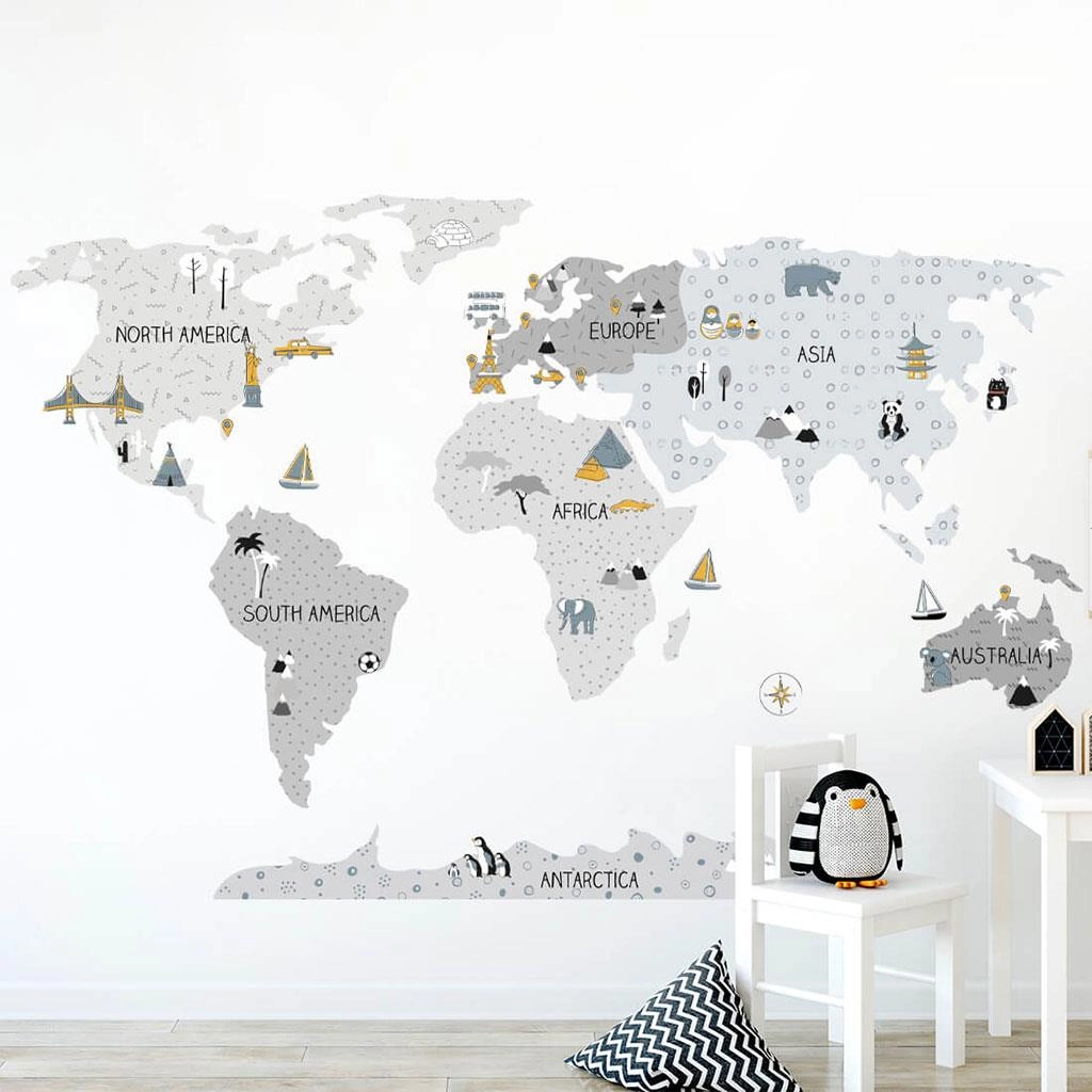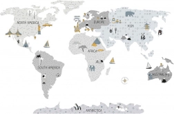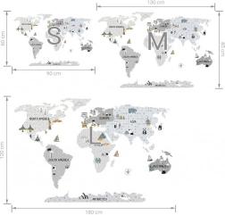 Ta designerska mapa świata w szarej palecie ociepli każdy pokój dziecięcy, a jednocześnie wspiera naukę poprzez zabawę. Dzieci naturalnie przyswoją nazwy kontynentów, oceanów i kierunków świata oraz odkryją zabytki i ciekawostki z różnych zakątków planety. Dzięki oddzielnie wycinanym elementom łatwo dopasujesz odstępy między kontynentami do przestrzeni na ścianie.