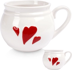 Duży ceramiczny kubek 800 ml z tłoczonymi czerwonymi serduszkami jest idealny do herbaty, kawy, kakao i grzanego wina. Ma wygodne ucho, łatwo się czyści w zmywarce i jest odpowiedni do mikrofali. Klasyczny kształt „brzuszka” świetnie leży w dłoni i ozdobi każdy stół.