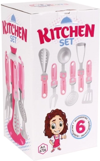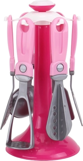 Jeśli jesteś miłośnikiem designerskich przedmiotów, w Twoim domu nie może zabraknąć tego oryginalnego stojaka z kuchennymi akcesoriami dla małych gospodyń. Niezbędny dodatek dla wszystkich małych kucharek i pomocnic w domu lub dla dziewczynek, które chciałyby ugotować coś pysznego dla swoich lalek. Zestaw zawiera 6 sztuk akcesoriów wraz z praktycznym stojakiem, dzięki czemu wszystko będziesz mieć pod ręką. Całość wykonana jest z wysokiej jakości i bezpiecznego plastiku. Odpowiednie dla dzieci od 3 lat.