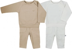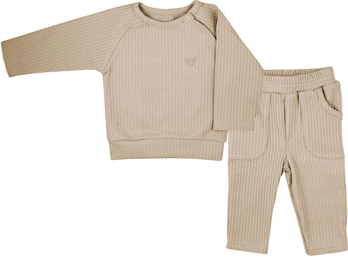 Stylowy 2‑częściowy zestaw niemowlęcy KOALA Bello w kolorze beżowym łączy wygodę z nowoczesnym wyglądem. Zawiera koszulkę z długim rękawem zapinaną na napki oraz spodenki dresowe z elastycznym pasem i kieszeniami. Z nowego materiału o teksturowanym wzorze dla maksymalnego komfortu i swobody ruchu.