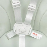 Pięciopunktowe pasy oraz barierka między nogami zapobiegają ześlizgnięciu, a miękka tapicerka z eko skóry jest łatwa w utrzymaniu i przyjemna w dotyku.