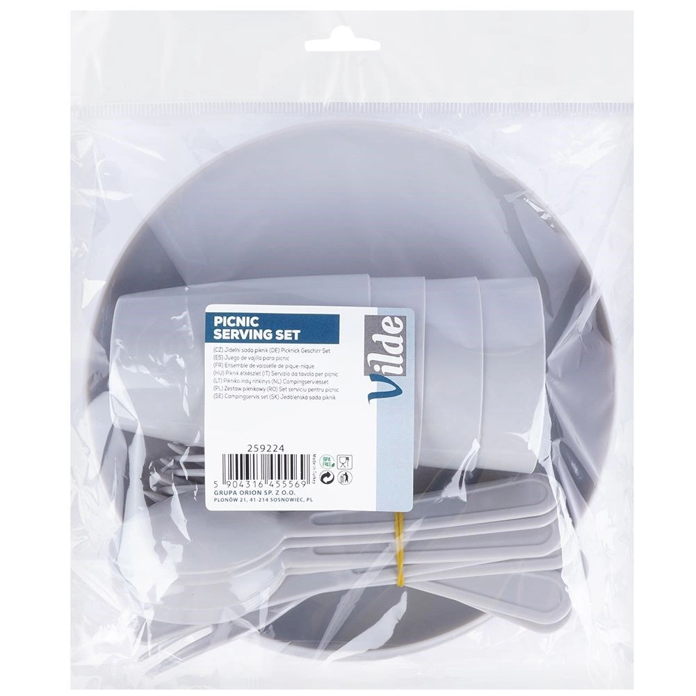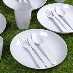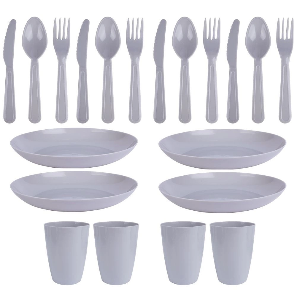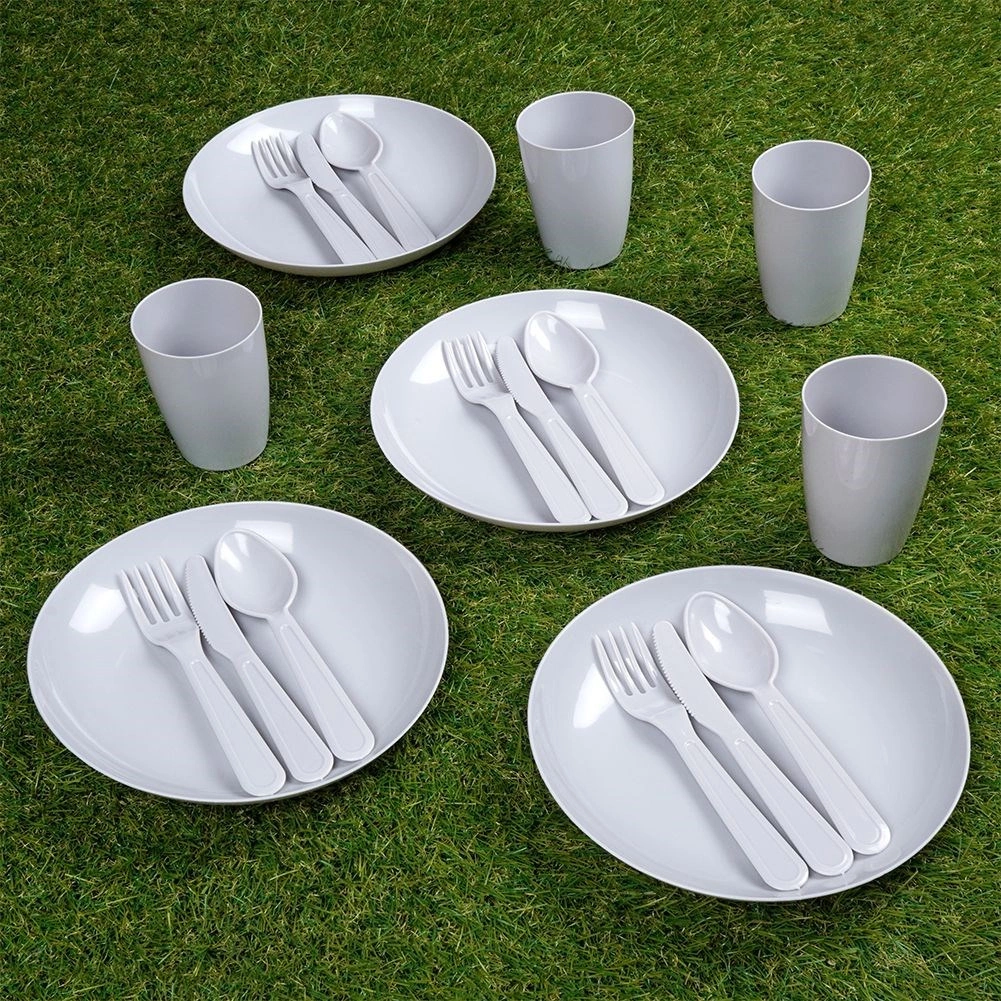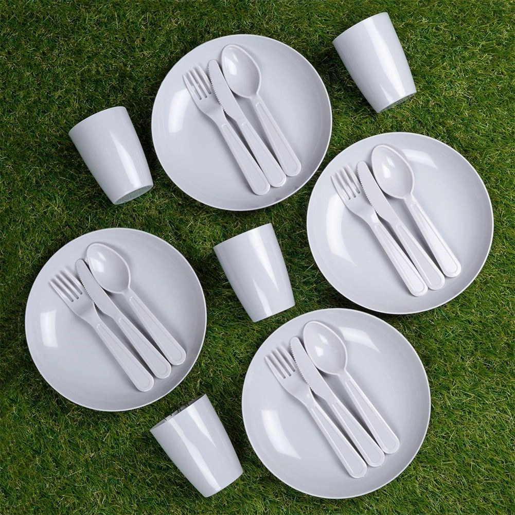 Kompletny plastikowy zestaw piknikowy dla 4 osób, łącznie 20 elementów, idealny na wycieczki, do ogrodu i na kemping. Zawiera cztery kubki, talerze i sztućce. Jest lekki, trwały, bez BPA i wielokrotnego użytku – świetna alternatywa dla produktów jednorazowych.