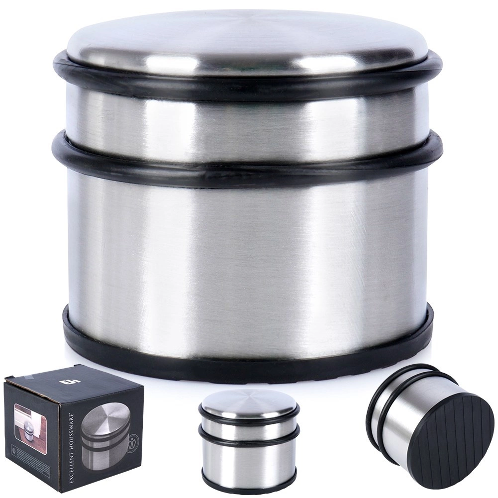Praktyczny i stabilny odbojnik do drzwi ze stali nierdzewnej o masie 1,1 kg skutecznie zapobiega niechcianemu zamykaniu oraz chroni ściany i meble. Dzięki gumowym elementom na obwodzie i na spodzie delikatnie tłumi uderzenia i nie ślizga się po podłodze. Bez wiercenia i klejenia, wystarczy postawić go na miejscu. Idealny do domu, biura i salonu.