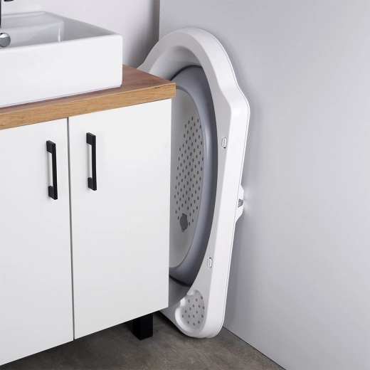 Ta składana wanienka wykonana jest z wytrzymałej termoplastycznej gumy i wysokiej jakości plastiku, dzięki czemu jest solidna, stabilna i długotrwale niezawodna. Dzięki sprytnemu mechanizmowi w kilka chwil rozłożysz ją i złożysz na płasko, by schować w wąskiej przestrzeni w łazience.