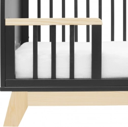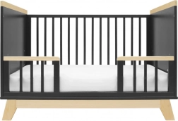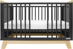 Bezpieczeństwo jest najważniejsze: łóżeczko posiada certyfikaty EN 716-1 i EN 716-2, ma trzy wyjmowane szczebelki dla łatwego przejścia starszego dziecka i jest pokryte ekologicznym lakierem wodnym. Ponadczasowe połączenie grafitowej barwy i naturalnego drewna pasuje do nowoczesnych wnętrz i łatwo je dopasować do pozostałych mebli.