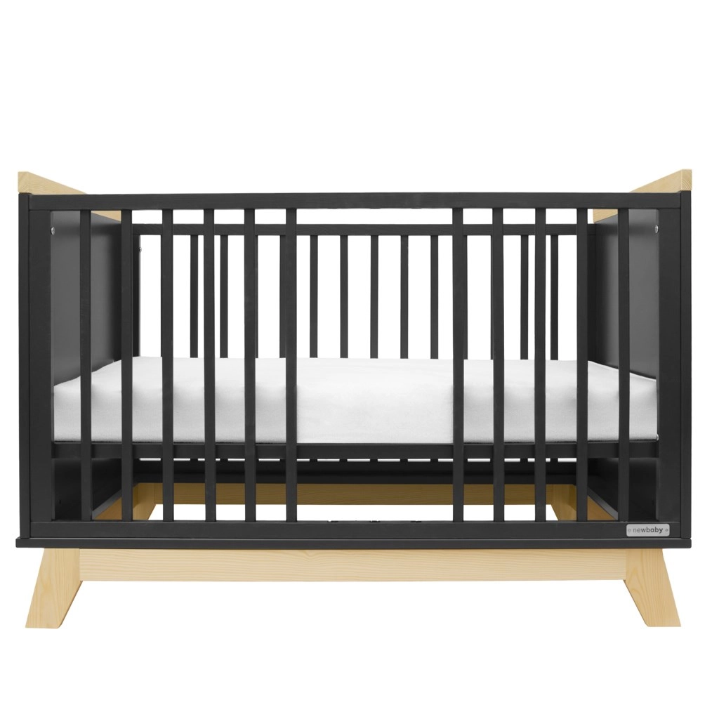 Stylowe łóżeczko dziecięce NEW BABY Marcus 120 × 60 cm w kolorze grafit/naturalne łączy w sobie skandynawski design, bezpieczeństwo i praktyczne funkcje. Solidna rama z sosny i wysokiej jakości płyty MDF zapewniają stabilność, a regulowany stelaż w 3 poziomach oraz barierka zabezpieczająca dbają o komfort i spokojny sen. Lakier wodny jest bezpieczny dla dzieci i środowiska oraz spełnia normy europejskie.