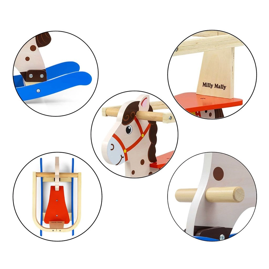 Przemyślane detale, takie jak uchwyty przy głowie, podnóżki i profilowane płozy, zapewniają komfort i stabilność podczas bujania. Konik dostarczany jest w estetycznym pudełku prezentowym, dzięki czemu świetnie sprawdzi się jako piękny prezent i jednocześnie będzie stylową ozdobą dziecięcego pokoju.