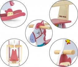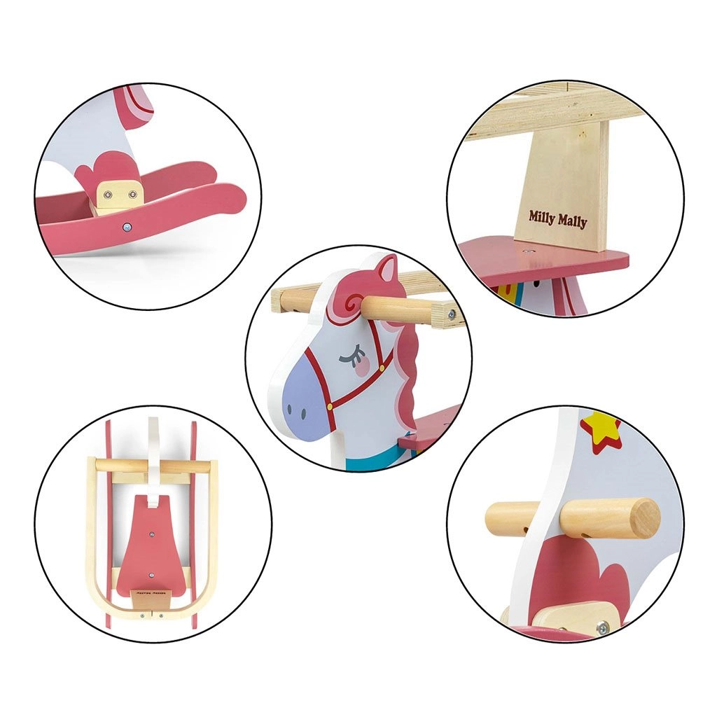 Konik wyposażony jest w solidne uchwyty, podnóżki oraz profilowane płozy, które zapewniają płynne kołysanie bez niepożądanego przewracania. Nowoczesny pastelowy design łatwo dopasuje się do każdego pokoju dziecięcego, a dzięki opakowaniu prezentowemu sprawdzi się także jako piękny prezent.