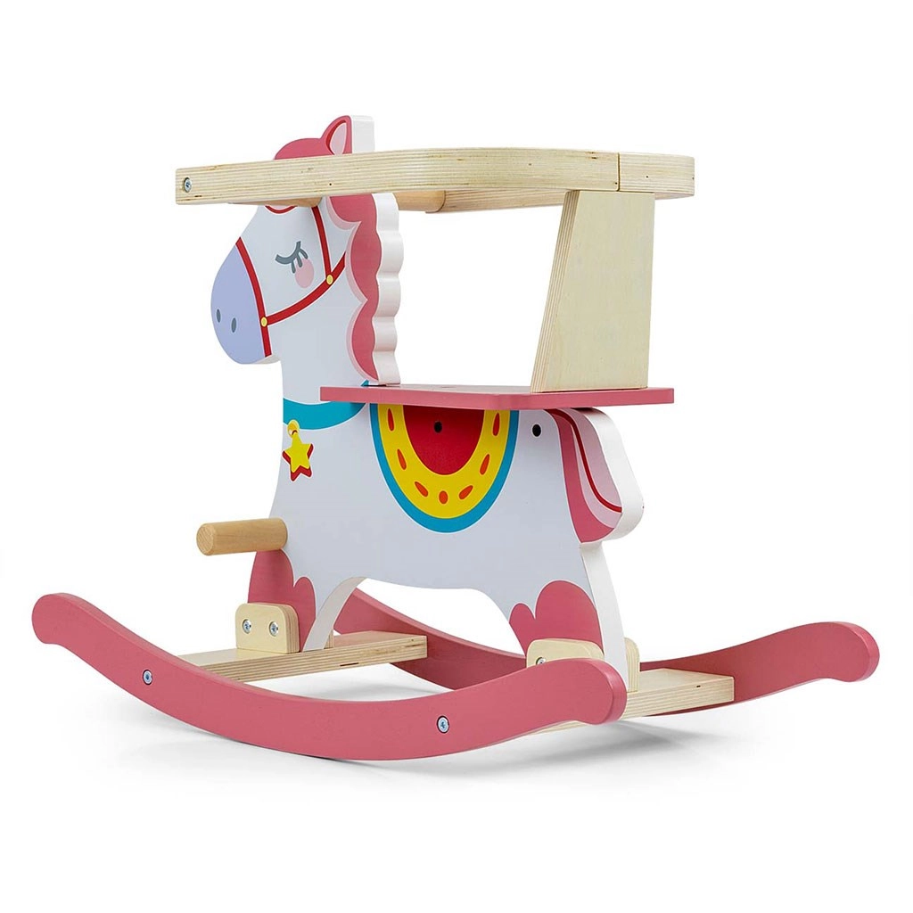Uroczy drewniany konik na biegunach MILLY MALLY Lucky w kolorze różowym zapewni dzieciom od 12 do 36 miesięcy mnóstwo bezpiecznej zabawy. Ma zdejmowane barierki bezpieczeństwa, uchwyty dla pewnego chwytu, podnóżki oraz stabilne, profilowane płozy dla komfortowego i wyważonego bujania. Wykonany z wysokiej jakości drewna i pokryty nietoksycznymi, ekologicznymi farbami.