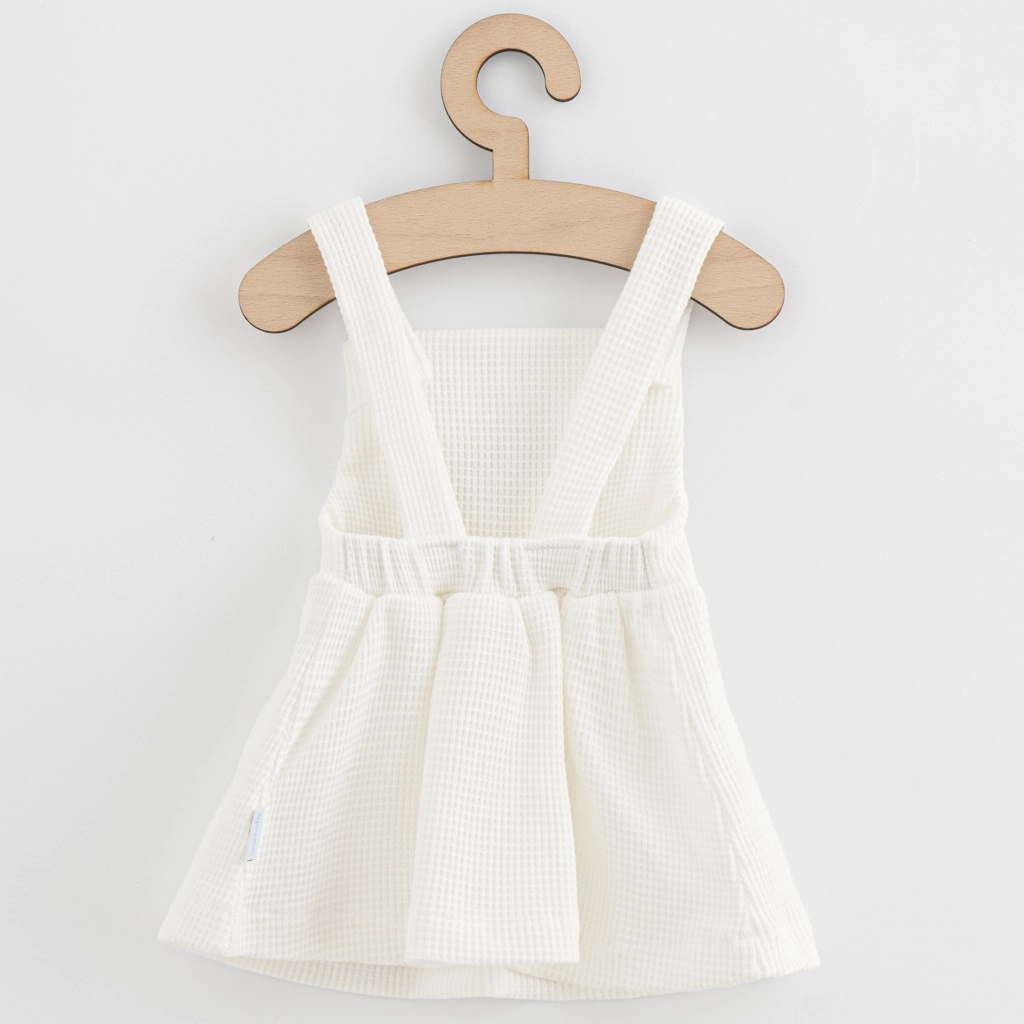 Stonowany biały kolor oraz plastikowa struktura materiału nadają sukience elegancki wygląd, który łatwo zestawisz z body, rajstopkami czy sweterkiem. Praktyczne guziczki ułatwiają ubieranie i pozwalają dopasować długość szelek według potrzeb.