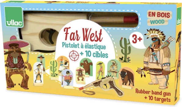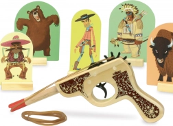 Ustaw tarcze, naciągnij gumkę i wyzwij rodzinę lub przyjaciół na pojedynek w salonie. Wysokiej jakości drewniane wykonanie zapewnia trwałość i długą żywotność zabawki, a atrakcyjny westernowy design zachwyci małych rewolwerowców.
