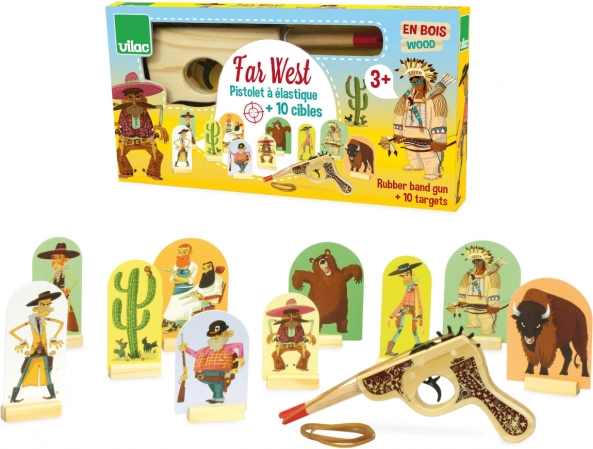 Poczuj atmosferę Dzikiego Zachodu z tym drewnianym pistoletem z tarczami marki VILAC. Gra jest idealna dla dzieci od 3 lat i pomaga trenować celność, koncentrację oraz motorykę małą. Wystarczy naciągnąć gumkę, ustawić tarcze i zacząć strzelać – zabawa dla całej rodziny.