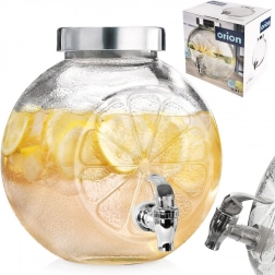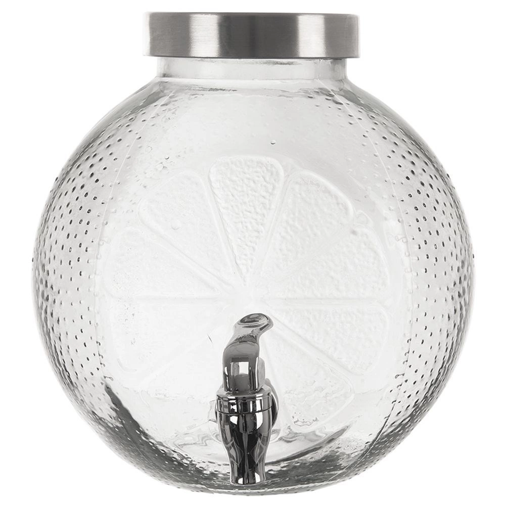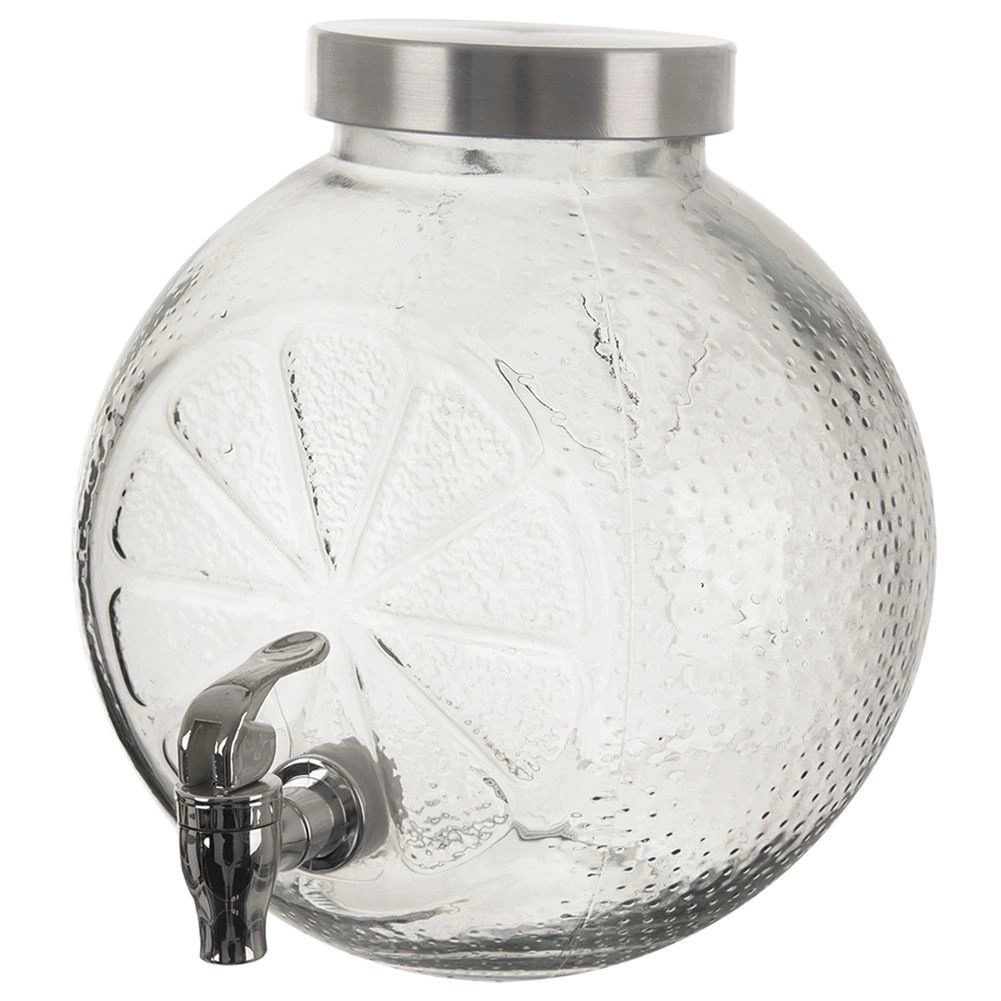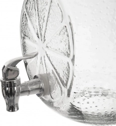 Wielkoobjętościowy szklany dyspenser z kranikiem elegancko poda wodę z owocami, lemoniadę oraz orzeźwiający poncz. Grube, wysokiej jakości szkło z reliefem plasterków cytrusów jest bezpieczne dla żywności i zapewnia atrakcyjny wygląd oraz solidność. Zakręcana metalowa pokrywka chroni zawartość przed zanieczyszczeniami i owadami, a metalowy kranik umożliwia wygodne nalewanie bez rozlewania.