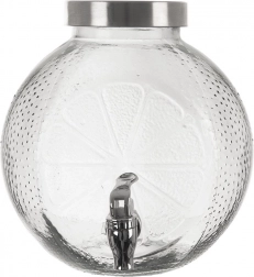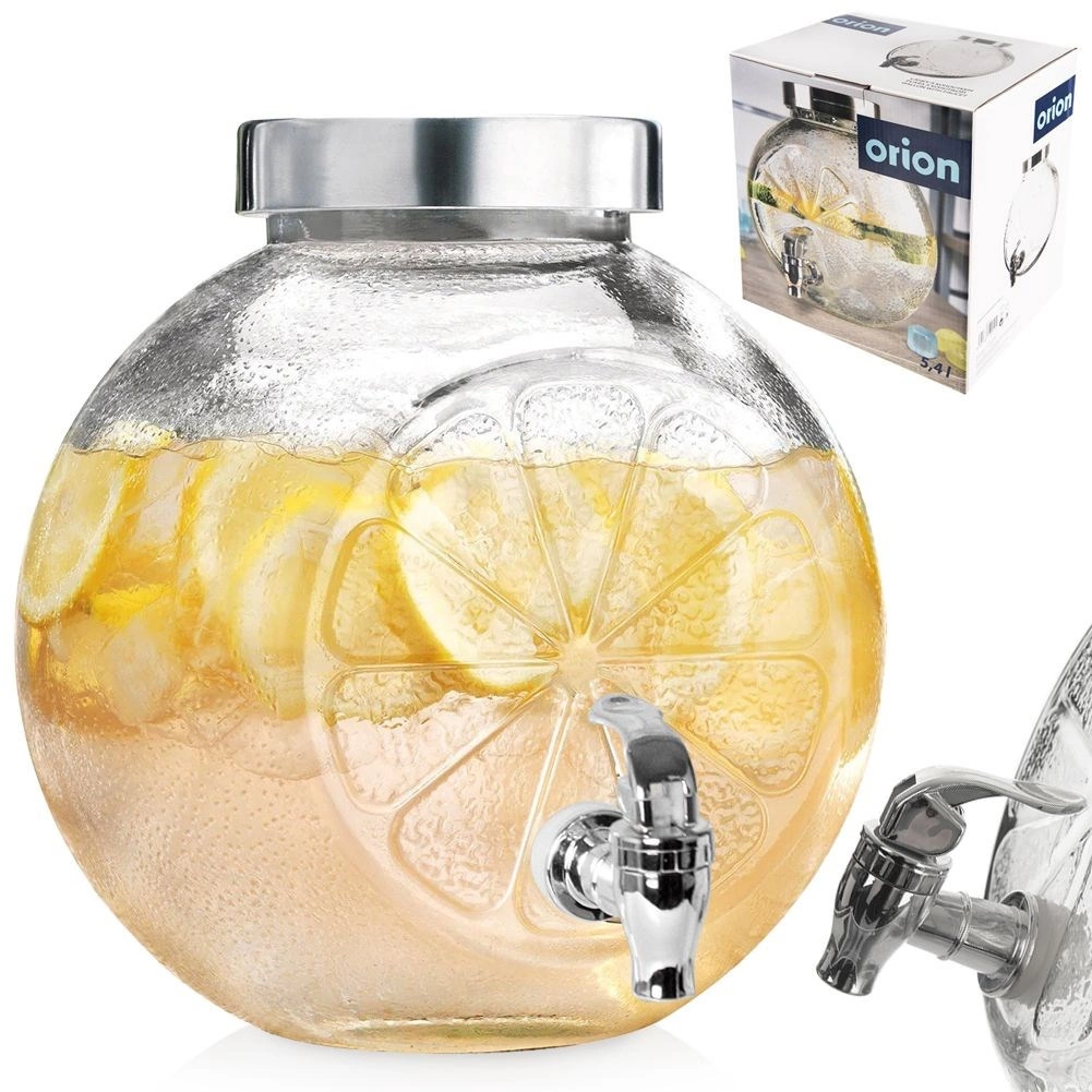Stylowy szklany dyspenser do napojów o pojemności 5,4 l z metalową pokrywką i praktycznym kranikiem jest idealny do lemoniad, soków oraz domowej ice tea. Solidne przezroczyste szkło z dekoracyjnym wzorem cytrusów, szeroki wlew dla łatwego napełniania oraz pokrywka chroniąca przed owadami czynią z niego doskonały wybór na ogrodowe przyjęcia i domowe serwowanie.