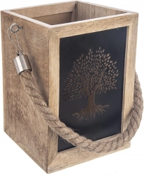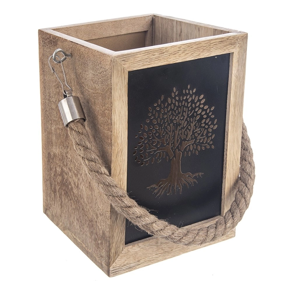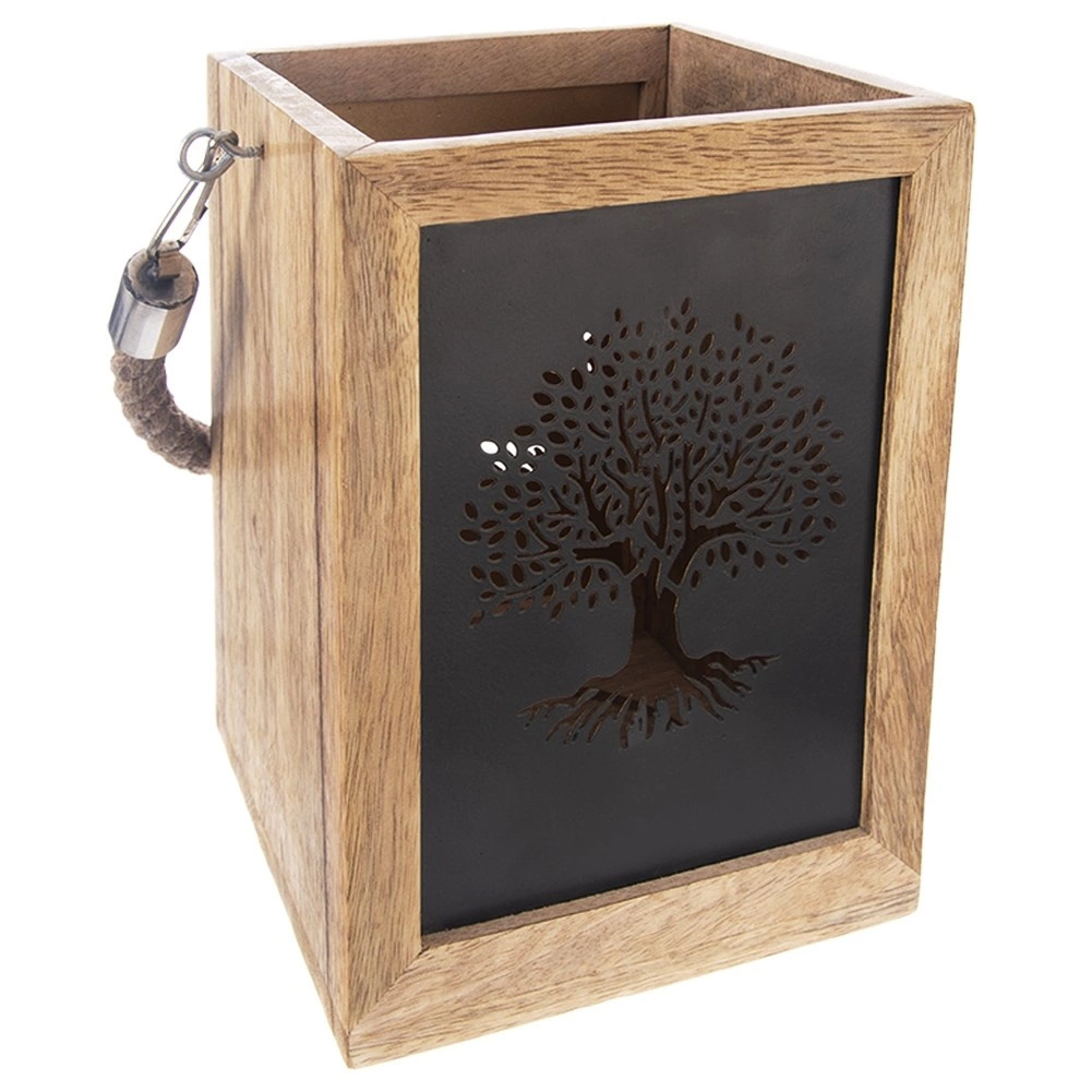 Gustowny lampion z egzotycznego drewna mango zachwyca naturalnym wyglądem i ciepłym światłem, które przenika przez metalowe panele z wyciętym motywem drzewa. Praktyczne wewnętrzne zagłębienie ułatwia umieszczenie świeczki lub szklanej wkładki. Dzięki solidnemu uchwytowi ze sznura lampion nadaje się do postawienia i zawieszenia.